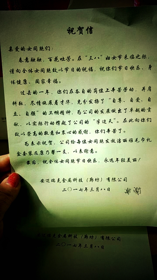 這些美麗、勤勞、善良的女員工發(fā)揮著各自的才華和智慧,她們以自己的實際行動撐起了公司的“半邊天”, 公司的發(fā)展離不開她們的辛勤付出。在這個特別的日子里,公司為每位女員工準(zhǔn)備了節(jié)日禮品及祝賀信,體現(xiàn)了公司對女員工的關(guān)愛和尊重。